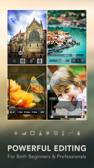 - Các hiệu ứng về Quang cảnh, HDR, Blur, ART, Vintage, Grunge, Beauty, Chuyên nghiệp, Đen & Trắng, và Màu nước.