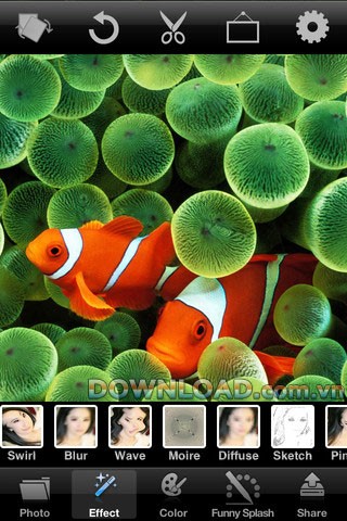 Ứng dụng cung cấp một thư viện hiệu ứng vô cùng đa dạng, đáp ứng mọi nhu cầu sáng tạo của bạn. Trong đó bao gồm các hiệu ứng nổi bật như: Sepia, Black and White, Pencil Paint, Mirror, Swirl, Neon Light, Hue Green, Rainbow, Emboss, Comic, Ice, Blur, Pinch, Wave, Old Film Frame, Solarize, Old Photo, và Oilpainting.