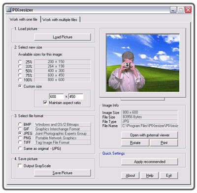 PIXresizer là một chương trình điều chỉnh kích thước ảnh miễn phí giúp bạn dễ dàng tùy biến các hình ảnh trên trang web cũng như email của bạn mà không làm thay đổi hình ảnh gốc.