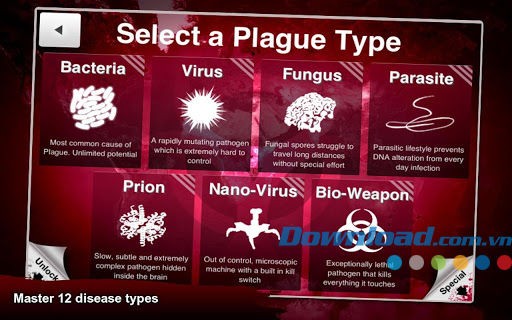 Cụ thể, người chơi có thể chọn virus với khả năng lây lan nhanh chóng nhưng dễ điều trị, prion gây ra các bệnh đột biến gen khó chữa nhưng tốc độ lây lan chậm, hoặc vũ khí sinh học gây tử vong nhanh nhưng khó lây lan trên diện rộng và dễ làm tăng mức báo động.