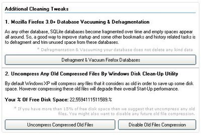 Chế độ Additional Cleaning Tweaks cung cấp các tính năng như tối ưu hóa cơ sở dữ liệu Firefox để tăng tốc độ trình duyệt và cho phép bạn tắt tính năng nén dữ liệu mặc định của Windows để duy trì hiệu suất hệ thống.