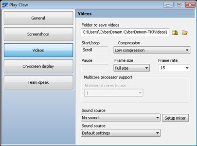 - Videos: Phần này dành cho các thiết lập liên quan đến việc quay video game. Bạn có thể chọn thư mục lưu trữ video (Folder to save videos), gán phím tắt để bắt đầu/dừng (Start/stop) và tạm dừng (Pause) quá trình quay, hủy video đang quay (Cancel record). Ngoài ra, bạn có thể điều chỉnh mức độ nén video (Compression) – ảnh hưởng trực tiếp đến dung lượng và chất lượng, kích thước khung hình (Frame size), tốc độ khung hình (Frame rate), số nhân xử lý video (Cores), và lựa chọn có quay cả con trỏ chuột (Capture cursor) hay không. Tính năng quay trước (Enable pre-record) cho phép bạn bắt đầu quay video trước một khoảng thời gian nhất định (max buffer size), và lựa chọn nguồn âm thanh để thu cùng video (Audio), bao gồm cả tùy chọn Multichannel Audio để thu nhiều nguồn âm cùng lúc.