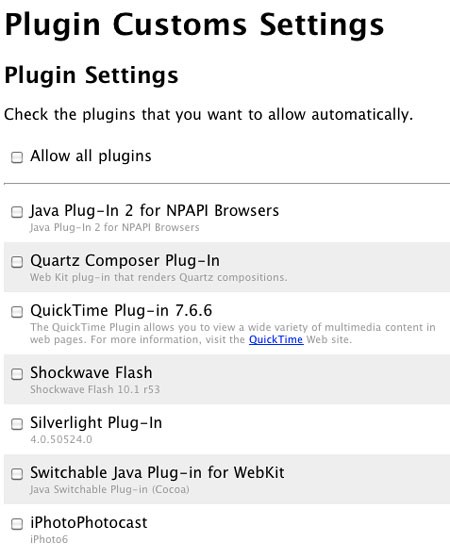 Plugin Customs được thiết kế để ngăn chặn tự động việc tải các nội dung đòi hỏi bất kỳ plugin nào của trình duyệt Safari, đặc biệt là Adobe Flash. Cơ chế này giúp bảo vệ trải nghiệm duyệt web của người dùng.
