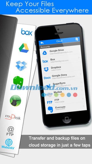 - Ứng dụng hỗ trợ Google Drive, Box, Dropbox, Google Docs, SugarSync, Mydisk.se, và máy chủ FTP/ WebDAV.