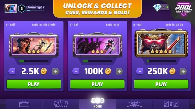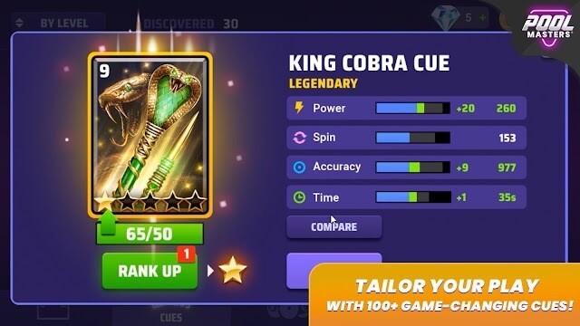 Điểm nổi bật của Pool Masters chính là hệ thống cơ bi-a độc đáo, cho phép người chơi sưu tầm và nâng cấp những cây cơ với phong cách riêng biệt.