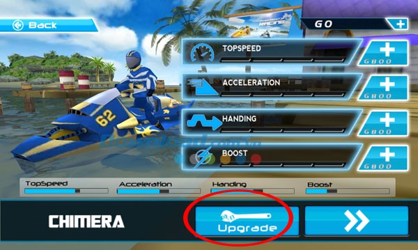 Trước mỗi màn chơi, màn hình Upgrade sẽ cung cấp 4 tùy chọn để bạn nâng cấp cho xuồng máy của mình, giúp nó trở nên mạnh mẽ hơn. Các tùy chọn bao gồm nâng cấp tốc độ tối đa, khả năng tăng tốc, độ chính xác khi điều khiển và sức mạnh tổng thể.