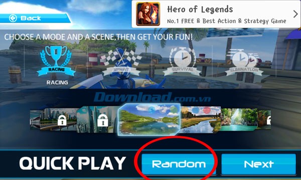 Bạn có thể chọn chế độ Random để Powerboat Racing 3D tự động chọn chế độ chơi và bối cảnh ngẫu nhiên cho bạn. Hoặc bạn có thể chọn thủ công và nhấn Next để bắt đầu cuộc đua.