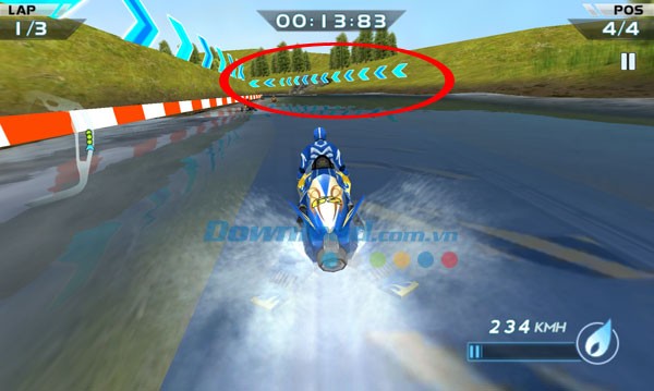 Trên đường đua, bạn sẽ thấy dãy mũi tên màu xanh liên tục xuất hiện để chỉ dẫn đường đi. Hãy chú ý theo dõi các mũi tên này để thực hiện các thao tác bẻ cua và chuyển hướng (bằng cách nghiêng thiết bị sang trái hoặc phải) nhằm tránh va chạm với vách núi hoặc ốc đảo. Ngoài ra, bản đồ thu nhỏ ở bên trái màn hình sẽ cung cấp cho bạn thông tin về sơ đồ đường đua, quãng đường còn lại và vị trí của bạn so với các đối thủ trong chế độ nhiều người chơi trực tuyến.