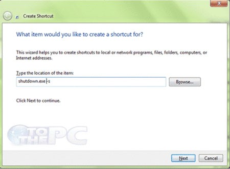 Trong hộp thoại xuất hiện, hãy nhập lệnh "shutdown.exe -s" và nhấn Next.