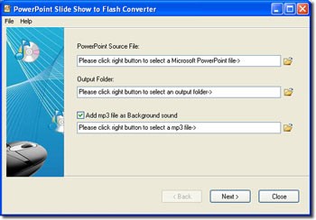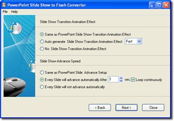 PowerPoint Slide Show to Flash Converter là một ứng dụng chuyên dụng, cho phép chuyển đổi các tập tin trình chiếu PowerPoint (PPT) sang định dạng Flash SWF. SWF là một định dạng độc lập với nền tảng, được sử dụng rộng rãi.