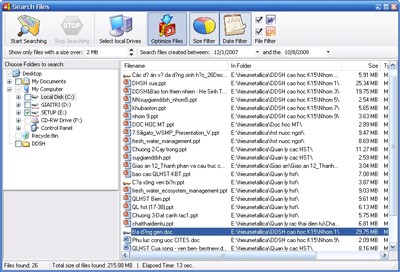 Thẻ Search files cung cấp một công cụ tìm kiếm file mạnh mẽ, giúp bạn dễ dàng tìm thấy các tập tin cần thiết trên các thư mục hoặc ổ đĩa theo kích thước (Size filer) hoặc thời gian (Date filter). Kết quả tìm kiếm sẽ hiển thị chi tiết về số lượng file tìm được và tổng dung lượng của chúng. Bạn có thể chọn và tối ưu hóa kích thước của các file này một cách nhanh chóng và dễ dàng.