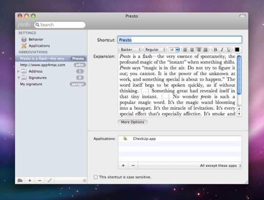 Với Presto, việc chèn một lời chào tiêu chuẩn, chữ ký (kể cả các đoạn văn bản đã được định dạng sẵn) hoặc các cụm từ quen thuộc vào bất kỳ ứng dụng nào trở nên dễ dàng hơn bao giờ hết.
