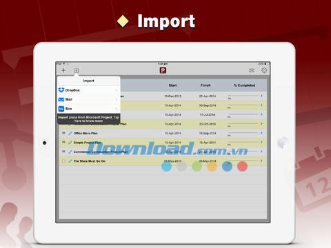 Ứng dụng hỗ trợ nhập dữ liệu dự án từ Microsoft Project thông qua các dịch vụ lưu trữ đám mây như Dropbox, Box, email hoặc iTunes.