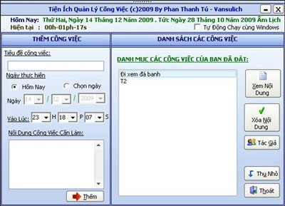 Sau khi hoàn tất tải về và giải nén, bạn chỉ cần nhấp đúp chuột vào file thực thi để khởi động chương trình. Giao diện của phần mềm được chia thành hai khu vực chính: khu vực lịch hẹn, nơi bạn có thể thiết lập nội dung, đặt lịch và hẹn giờ, và danh sách công việc đã được "niêm yết" trước đó.