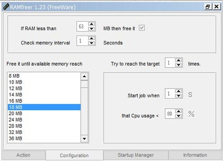 - Tại mục If RAM less than ‘X’ MB then Free it, hãy đặt giá trị là 16MB (hoặc cao hơn). Như vậy, mỗi khi dung lượng RAM còn trống ít hơn 16MB, phần mềm sẽ tự động giải phóng để thu hồi bộ nhớ.