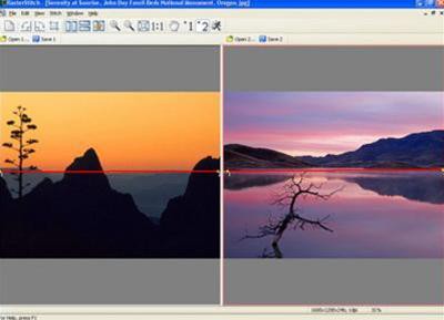 Thực hiện tương tự các bước trên với bức ảnh bên phải, với mục đích chia tấm hình mặt hồ thành hai phần bằng nhau, tương ứng với bức ảnh núi non. Sau khi đã chia đôi cả hai hình ảnh cần ghép, chỉ cần nhấn vào nút “Start Stiching” (có hình người đang chạy) để RasterStich tự động ghép phần trên của hình núi non với phần dưới của hình mặt hồ, tạo nên một bức ảnh số đầy ấn tượng.