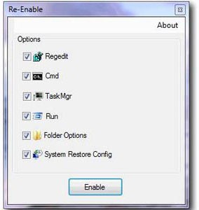 Để khắc phục tình trạng này, phần mềm Re-Enable có thể là một giải pháp hữu ích. Chương trình này được thiết kế để kích hoạt lại các chức năng mà virus đã vô hiệu hóa trong quá trình tấn công.