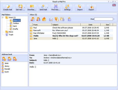 - Quản lý danh bạ (Address book) của Reach-a-Mail Pro vượt trội hơn so với Microsoft Outlook và Outlook Express. Bạn có thể thêm địa chỉ mới thủ công hoặc tự động lưu địa chỉ từ thư nhận được bằng cách nhấp chuột phải và chọn Add contact to address book.