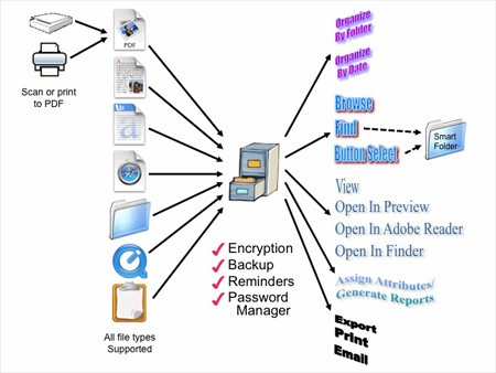 - Truy cập nhanh chóng các file đã lưu trữ trong cơ sở dữ liệu, bao gồm duyệt file, tìm kiếm, sử dụng thư mục thông minh và xuất file, in ấn.