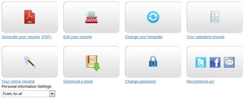 Màn hình chính của Resumesimo cung cấp các tùy chọn quản lý CV như sau: (PDF): tải CV dưới dạng file PDF, : chỉnh sửa thông tin cá nhân, : thay đổi mẫu CV, : tải về CV với định dạng tiêu chuẩn, : tạo liên kết trực tuyến để chia sẻ CV, : tải về cuốn sách điện tử hướng dẫn tìm việc do Resumesimo biên soạn và : thay đổi mật khẩu đăng nhập.