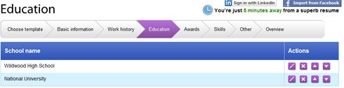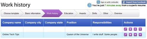 Đến với mục Work history, nếu bạn đã kết nối tài khoản LinkedIn hoặc Facebook, kinh nghiệm làm việc của bạn sẽ tự động hiển thị. Bạn có thể chỉnh sửa hoặc bổ sung thêm thông tin nếu cần thiết.