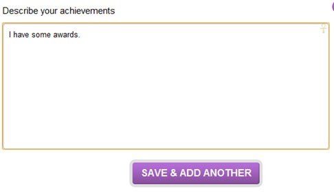 Mục Awards yêu cầu bạn liệt kê các giải thưởng đã đạt được. Thông tin này không được tự động điền, vì vậy hãy nhập mô tả chi tiết vào ô Describe your achievements, sau đó nhấn Save & add another để thêm giải thưởng khác hoặc Next step để chuyển sang bước tiếp theo.