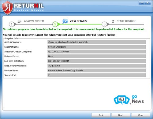 Returnil System Safe 2011 sẽ tự động ghi lại những thay đổi diễn ra trên hệ thống và tạo các điểm khôi phục phù hợp. Trong trường hợp hệ thống gặp vấn đề, bạn chỉ cần nhấn Start ở phần Full Restore để hiển thị danh sách các bản sao lưu, kèm theo đầy đủ thông tin như ngày giờ, thời điểm quét máy và số lượng virus đã được phát hiện.