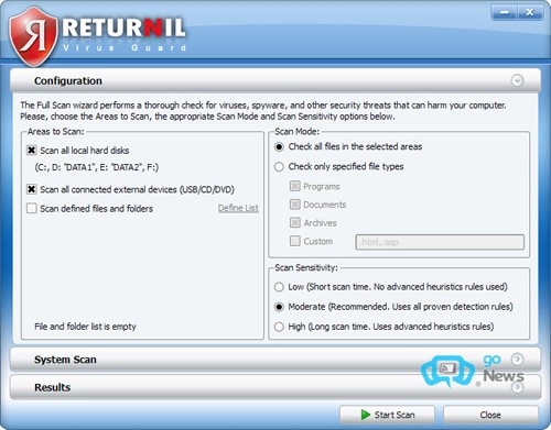 Để tiến hành quét sâu toàn hệ thống, hãy nhấn Start ở bên phải mục Full Scan. Trong phần Areas to Scan, bạn có thể chọn các đối tượng cần quét: Scan all local hard disks (quét toàn bộ các ổ đĩa cứng), Scan all connected external devices (quét các thiết bị ngoại vi kết nối như ổ USB, đĩa CD/DVD), Scan defined files and folders (quét các tập tin và thư mục được chỉ định).