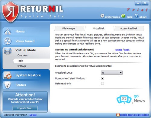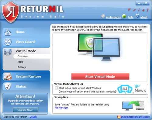 Virtual Mode là một tính năng cho phép bạn nhanh chóng đưa hệ thống vào trạng thái bảo vệ, tương tự như việc “đóng băng” nó, mà không cần phải thực hiện khởi động lại máy tính (bằng cách chọn Start Virtual Mode). Nhờ đó, bạn có thể thoải mái chạy và kiểm tra các ứng dụng có khả năng gây hại, hoặc truy cập các trang web không đáng tin cậy mà không phải lo lắng về nguy cơ bị virus tấn công và làm hỏng hệ thống.