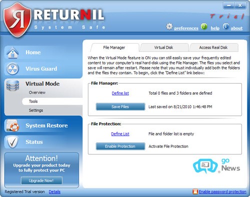 Với Returnil System Safe 2011, người dùng có thể yên tâm trước các mối đe dọa từ virus và những sự cố bất ngờ có thể xảy ra với hệ điều hành Windows.