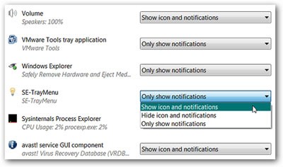 Để đảm bảo SE-TrayMenu luôn sẵn sàng sử dụng, hãy mở cửa sổ Notification Area Icons và điều chỉnh thiết lập cho SE-TrayMenu thành Show icon and notifications.