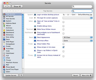 Secrets tích hợp thiết lập cho hơn 40 ứng dụng, bao gồm các ứng dụng mặc định của Apple như Mail, iCal, iChat, Finder, Front Row, Keynote, và các ứng dụng của bên thứ ba như Adium, Audio Hijack Pro, BBedit, EyeTV, WMware, Fusion, TextMate.
