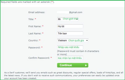 Một trang mới sẽ hiện ra, yêu cầu bạn cung cấp thông tin để nhận mã bản quyền. Hãy điền đầy đủ các trường có đánh dấu * màu đỏ, sau đó nhấn "Continue".