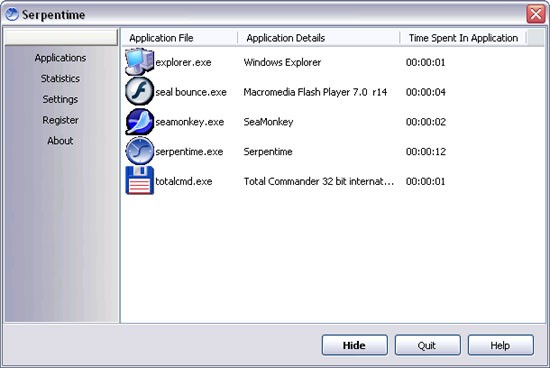 Serpentime 1.1 cung cấp khả năng hiển thị chi tiết khoảng thời gian bạn dành cho từng ứng dụng đang hoạt động trên máy tính. Công cụ này cho phép bạn quan sát thời gian làm việc hiệu quả cũng như thời gian nghỉ ngơi của bản thân.