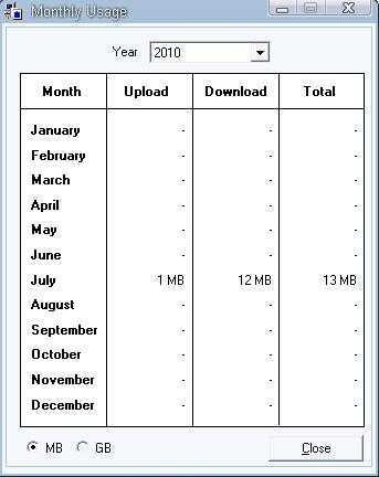 Trong cửa sổ Monthly Usage, bạn sẽ thấy thông tin chi tiết về dung lượng tải xuống, tải lên, cũng như tổng dung lượng sử dụng của tháng hiện tại và các tháng trong năm. Bạn có thể lựa chọn đơn vị hiển thị là MB hoặc GB để dễ dàng theo dõi và quản lý.
