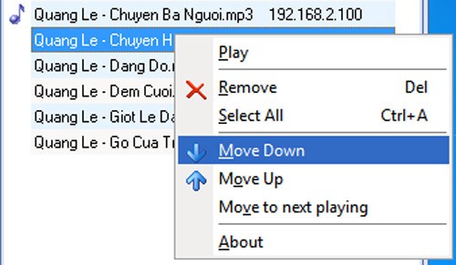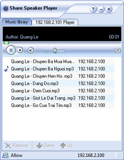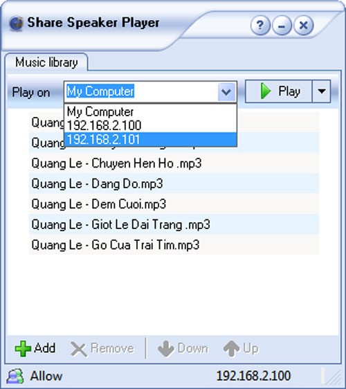 Tên của các tập tin nhạc đã được chọn sẽ hiển thị trên giao diện chính của Share Speaker Player. Bạn hãy nhấp vào mũi tên thả xuống tại mục Play on và chọn địa chỉ IP của máy tính có loa được kết nối. Theo giả định trong bài viết này, chúng ta sẽ chọn máy tính thứ hai với địa chỉ IP là 192.168.2.101. Sau khi đã chọn, hãy nhấn nút Play để bắt đầu phát nhạc.