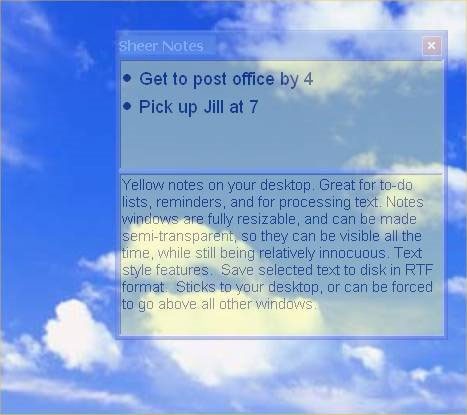 Sheer Notes 1.1 được thiết kế để hoạt động tương tự như những mẩu ghi chú nhỏ được “dán” trực tiếp lên màn hình desktop, giúp bạn không bỏ lỡ bất kỳ công việc quan trọng nào.