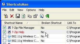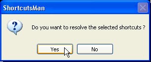 Ví dụ: Trong tình huống cụ thể, shortcut của ứng dụng 7-Zip có thể bị lỗi do thư mục cài đặt đã được thay đổi. Khi sử dụng chức năng sửa lỗi, chương trình sẽ quét tìm file thực thi có tên tương ứng và thiết lập lại đường dẫn chính xác cho shortcut 7-Zip. Để thực hiện, hãy đánh dấu chọn các shortcut cần sửa chữa và nhấn vào nút Resolve Selected Shortcuts. Một hộp thoại xác nhận sẽ xuất hiện, nhấn Yes để tiếp tục. Bạn có thể tắt hộp thoại xác nhận này bằng cách bỏ chọn mục Ask Before Any Action trong trình đơn Options.