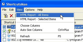 Nếu bạn muốn xem một báo cáo của tất cả các shortcut dưới dạng HTML, chọn HTML Report – All Items từ trình đơn View. Bạn cũng có thể tạo báo cáo HTML chỉ chứa các shortcut đã chọn bằng cách chọn HTML Report – Selected Items.