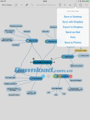 - Xuất file đa dạng: Xuất bản đồ tư duy sang Dropbox với các định dạng PDF, PNG, HTML, văn bản, Freemind hoặc opml.
