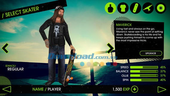 Chọn lựa từ 9 nhân vật khác nhau và cá nhân hóa từng nhân vật theo sở thích cá nhân bằng các thông số độc đáo. Tự do lựa chọn các loại ván trượt, trục và bánh xe, bao gồm các sản phẩm từ Powell & Peralta, Bones, Golden Dragon và Tork Trucks.
