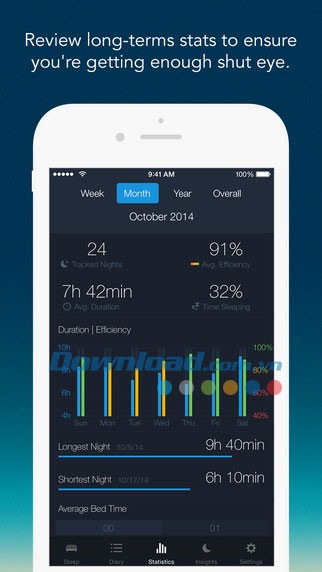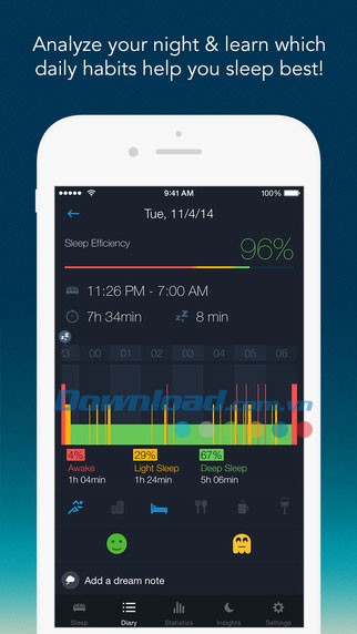 Ứng dụng cung cấp khả năng phân tích chi tiết về giấc ngủ nông, giấc ngủ sâu, cũng như thời gian bạn thức giấc trong đêm, cả khi bạn vừa chìm vào giấc ngủ lẫn khi thức dậy vào buổi sáng.