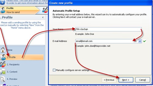 Đầu tiên, bạn cần cấu hình thông tin cá nhân và email cho phần mềm bằng cách chọn mục 1 "Profile" ở cột bên trái. Một hộp thoại sẽ mở ra. Tại đây, nhập tên của bạn vào trường Your Name, địa chỉ email của bạn vào trường E-mail Address, sau đó nhấn nút Next.