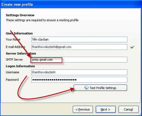 Phần mềm sẽ tự động nhận dạng địa chỉ email bạn đã nhập để xác định máy chủ SMTP. Nếu bạn sử dụng dịch vụ email riêng, hãy nhập lại địa chỉ SMTP vào mục SMTP Server trong hộp thoại tiếp theo. Sau đó, kiểm tra lại tất cả thông tin và nhấn nút Test Profile Settings để kiểm tra kết nối. Nếu thành công, thông báo sẽ xuất hiện và một email xác nhận sẽ được gửi đến địa chỉ email bạn đã cung cấp.