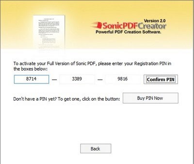 Mặc định, phần mềm chỉ cung cấp bản dùng thử trong 7 ngày. Bản đầy đủ có giá 75 USD. Tuy nhiên, hiện tại, Investintech đang có chương trình khuyến mãi đặc biệt, cung cấp mã bản quyền miễn phí cho Sonic PDF Creator.