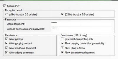 - Ở bước tiếp theo, bạn có thể chọn mức độ bảo mật (bảo mật 128-bit sẽ an toàn hơn). Điền mật khẩu ở hai khung bên dưới (mật khẩu để mở file và mật khẩu để thay đổi thông tin trên file).