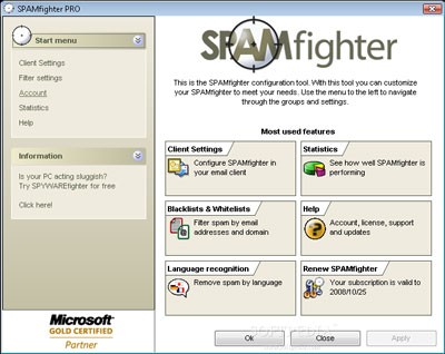 Giao diện "Settings" chính của SPAMfighter |