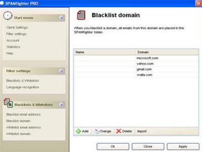 - Chặn Domain Website: Để ngăn chặn toàn bộ thư rác từ một website cụ thể, nhấn vào “Open” ở thẻ “Blacklist Domain”, sau đó nhấn “Add” và nhập địa chỉ trang web đó. Ví dụ, để chặn tất cả thư từ Yahoo Mail, Gmail hoặc Hotmail, bạn chỉ cần nhập “yahoo.com”, “gmail.com” hoặc “microsoft.com” vào ô “Domain”.