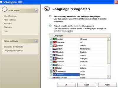 Một tính năng độc đáo của SPAMfighter là khả năng lọc thư theo ngôn ngữ. Để sử dụng tính năng này, bạn vào “More…” -> “Options” -> chọn thẻ “Languages recognition”. SPAMfighter mặc định sẽ “Reject email in the selected languages” (Từ chối email bằng các ngôn ngữ đã chọn). Bạn chỉ cần đánh dấu vào các ngôn ngữ bạn muốn chặn, và SPAMfighter sẽ tự động chuyển tất cả email được viết bằng các ngôn ngữ đó vào thùng rác.