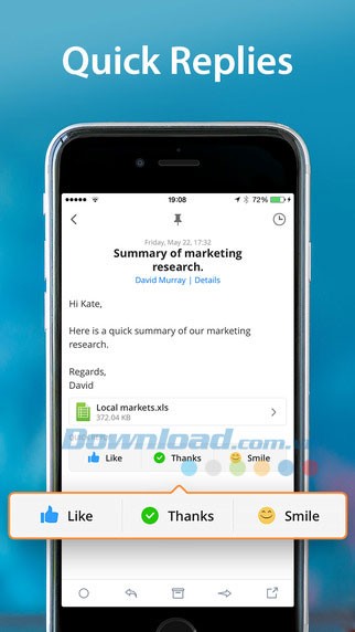 Thể hiện cảm xúc của bạn đối với Email nhận được chỉ bằng một chạm thông qua các biểu tượng Like, Thanks hoặc Smile..., giúp giao tiếp trở nên thân thiện và hiệu quả hơn.